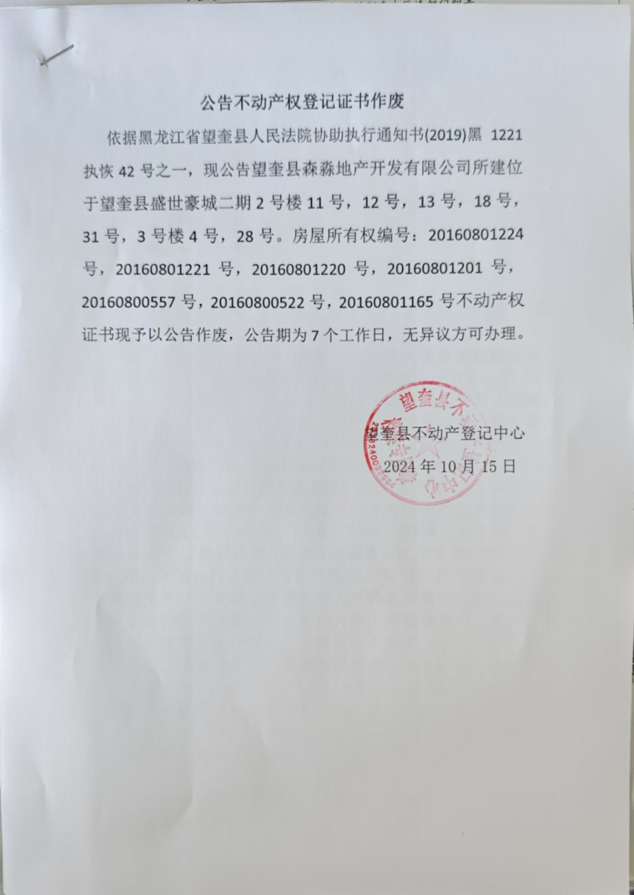 不动产所有权证作废公告--望奎县森淼房地产开发有限公司
