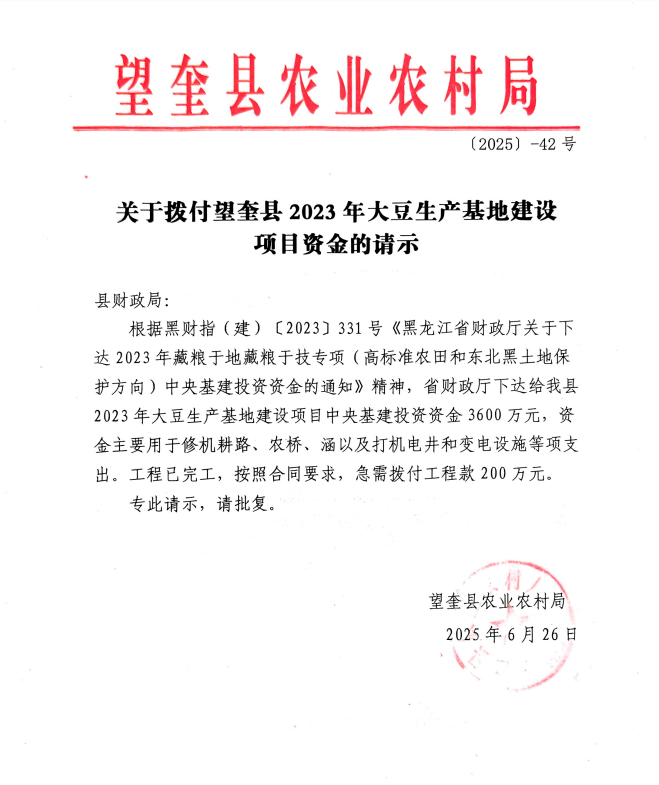 关于拨付望奎县2023年大豆生产基地建设项目资金的请示