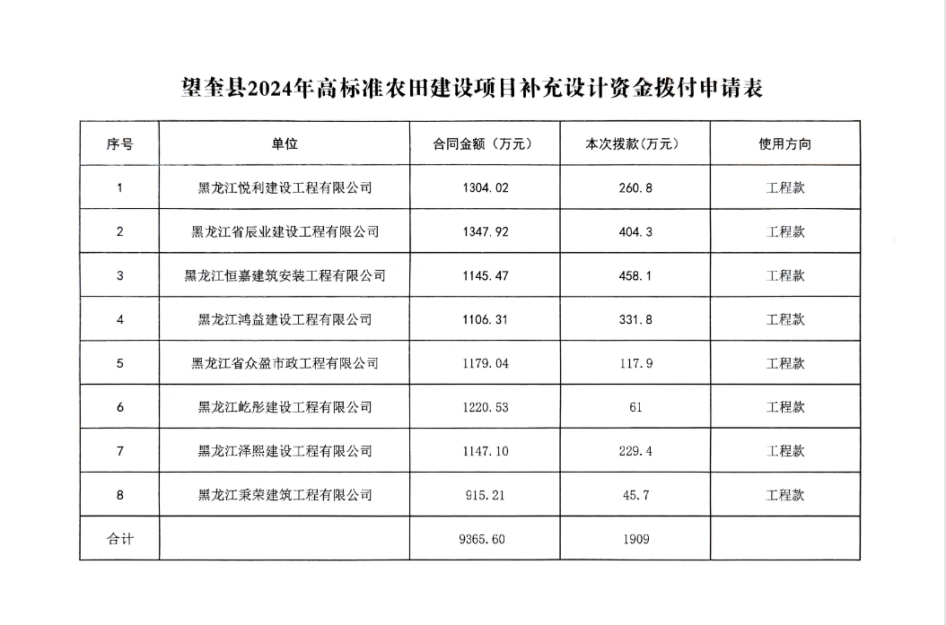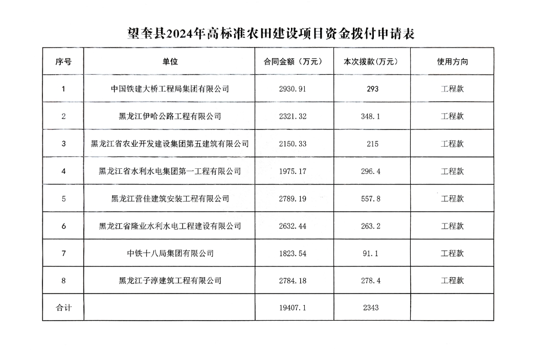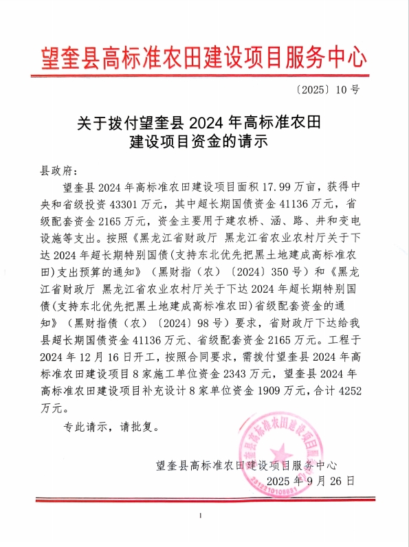 关于拨付望奎县2024年高标准农田建设项目资金的请示(望奎县高标准农田建设项目服务中心[2025]10号)