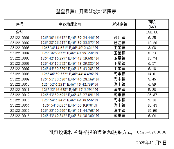 按照《中华人民共和国水土保持法》第二十条和《黑龙江省水土保持条例》第二十一条规定,和《水利部关于加强水土保持空间管控的意见》(水保〔2024〕4号)要求,现对我县禁止开垦陡坡地范围划定成果予以公告:
